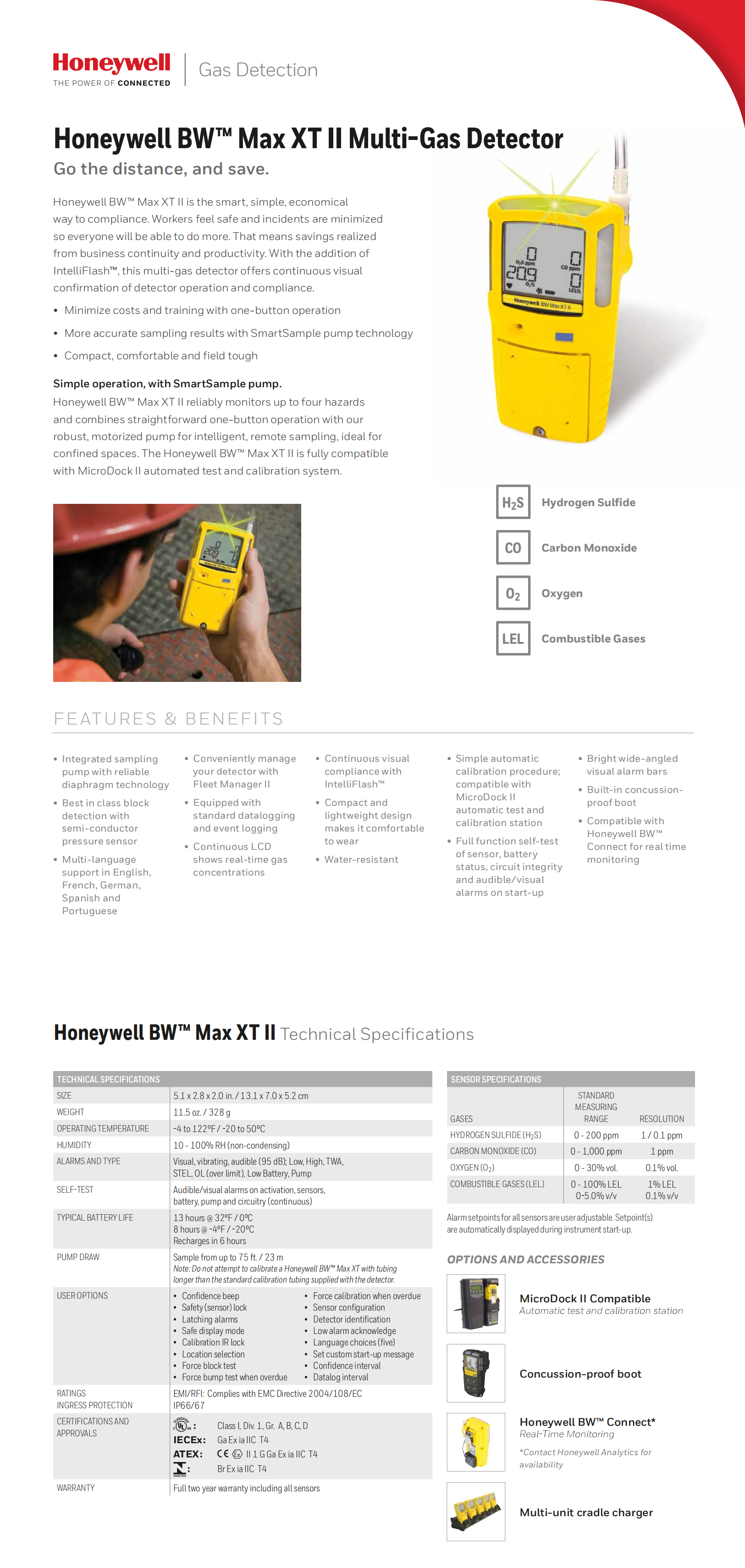 Honeywell BW? Max XT ll 能夠可靠地監(jiān)測多達(dá)四種危害氣體,同時將直觀的單按鈕界面操作與堅固耐用的電動泵相結(jié)合,可以進(jìn)行智能、遠(yuǎn)程采樣,非常適用于密閉空間。