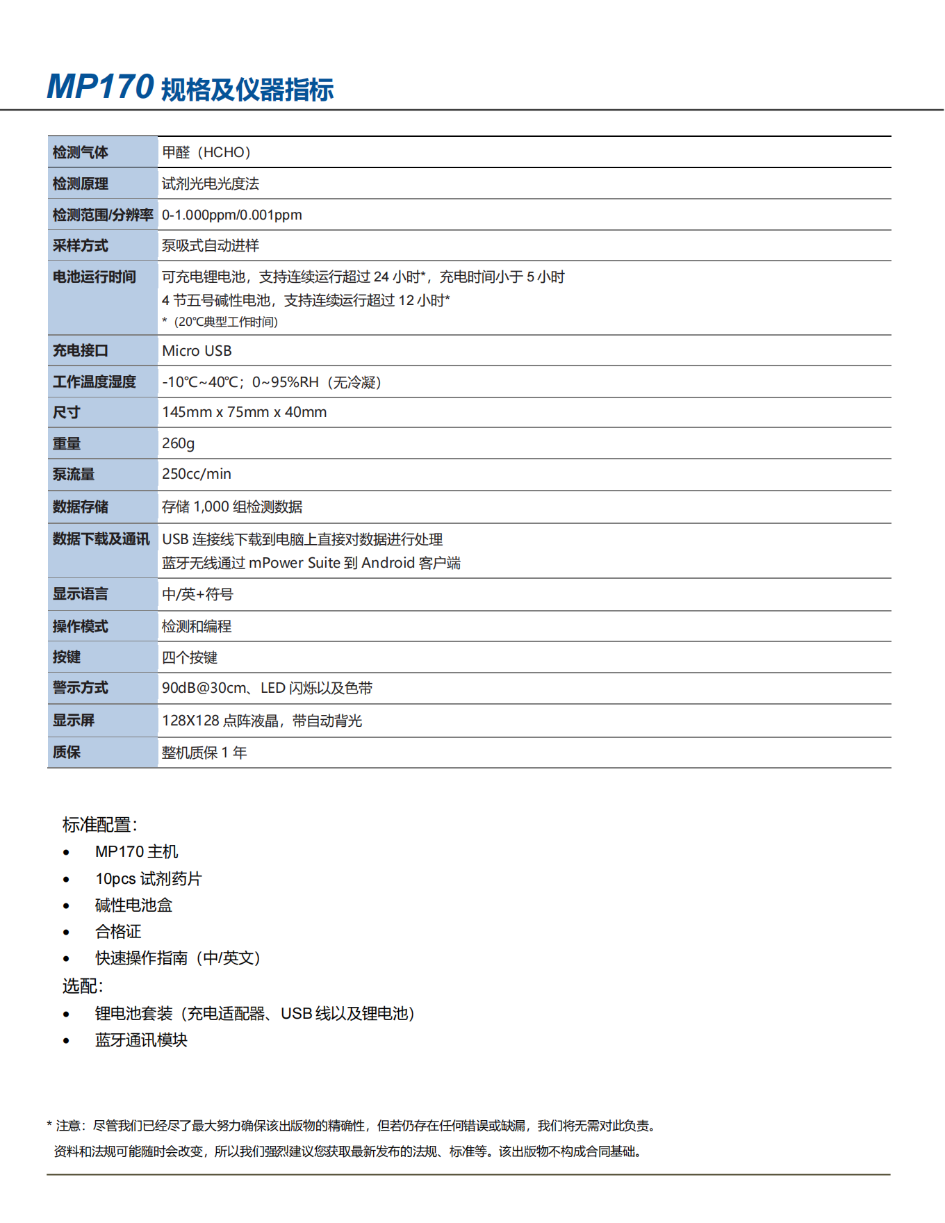 MP170 甲醛快速檢測儀是一款按照國家標(biāo)準(zhǔn)《GB/T 18204.2 公共衛(wèi)生場所檢驗(yàn)方法 第 2 部分:化學(xué)污染物》中7.4 光電光度法的標(biāo)準(zhǔn)要求設(shè)計的一款快速檢測設(shè)備。采用試劑藥片可以直接檢測空氣中甲醛的濃度,檢測時間短、無需長時間暴露在現(xiàn)場環(huán)境中;設(shè)備自動識別不同量程范圍試劑藥片,操作方便,無需專業(yè)實(shí)驗(yàn)室人員即可對甲醛進(jìn)行準(zhǔn)確快速檢測;Micro-USB 充電方式,一次充電可以滿足超過 24 小時的連續(xù)檢測;MP170 采用自動背光 LCD顯示屏,支持多國語言并清晰可見;MP170 可選擇藍(lán)牙模塊,將數(shù)據(jù)導(dǎo)出并實(shí)時編輯。工業(yè)級的外殼設(shè)計,保證了產(chǎn)品穩(wěn)定性和一致性。MP170 可應(yīng)用在室內(nèi)空氣質(zhì)量、職業(yè)衛(wèi)生健康、建材、公共衛(wèi)生、環(huán)境保護(hù)、應(yīng)急檢測、建筑工程竣工驗(yàn)收等領(lǐng)域,是甲醛快速準(zhǔn)確檢測的不二選擇。