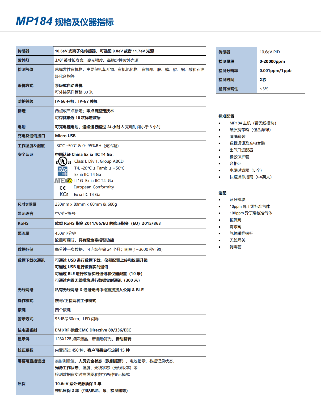 MP184手持式檢測儀秉承了將PID方式應(yīng)用于VOC快速檢測的初衷,為客戶提供便攜、準(zhǔn)確、快速和兼具經(jīng)濟(jì)性的檢測產(chǎn)品。MP184實時檢測數(shù)據(jù)有圖形和數(shù)字兩種顯示模式,智能繪圖顯示氣體濃度動態(tài),支持中英文操作界面;低功耗檢測器,一次充電可支持超過24小時連續(xù)檢測;數(shù)據(jù)自動存儲,數(shù)據(jù)下載方式可以通過有線或者無線方式,數(shù)據(jù)實時通訊亦可以選擇有線或者無線方式。其中無線方式可以靈活的選擇藍(lán)牙或者無線模塊, MP184內(nèi)置跌倒報警結(jié)合無線傳輸功能,可以將現(xiàn)場檢測數(shù)據(jù)實時傳輸?shù)奖O(jiān)測端,這樣最大限度的保護(hù)了現(xiàn)場工作人員的職業(yè)衛(wèi)生健康與安全。 MP184 應(yīng)用在石油石化、化工、室內(nèi)空氣質(zhì)量、職業(yè)衛(wèi)生健康、環(huán)境保護(hù)、應(yīng)急檢測、土壤污染物、工程竣工驗收、以及電子產(chǎn)品VOC殘留等各個領(lǐng)域