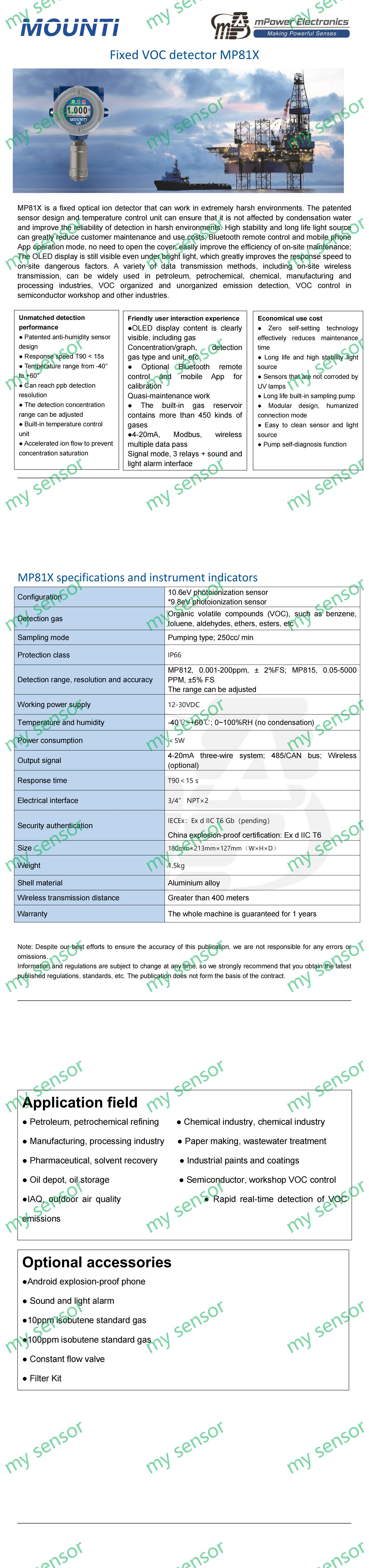 MP81X is a fixed optical ion detector that can work in extremely harsh environments. The patented sensor design and temperature control unit can ensure that it is not affected by condensation water and improve the reliability of detection in harsh environments. High stability and long life light source can greatly reduce customer maintenance and use costs; Bluetooth remote control and mobile phone App operation mode, no need to open the cover, easily improve the efficiency of on-site maintenance; The OLED display is still visible even under bright light, which greatly improves the response speed to on-site dangerous factors. A variety of data transmission methods, including on-site wireless transmission, can be widely used in petroleum, petrochemical, chemical, manufacturing and processing industries, VOC organized and unorganized emission detection, VOC control in semiconductor workshop and other industries.