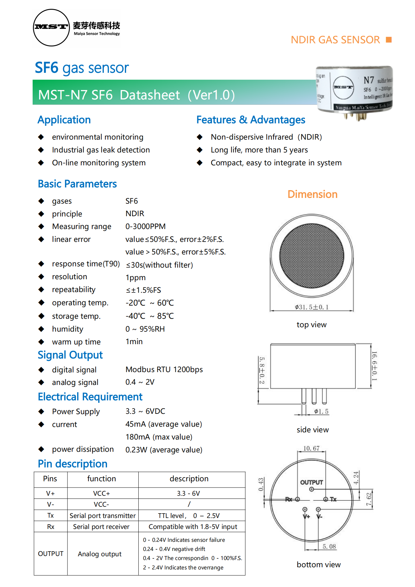 Features & Advantages Non-dispersive Infrared(NDIR) Long life, more than 5 years Compact, easy to integrate in system
