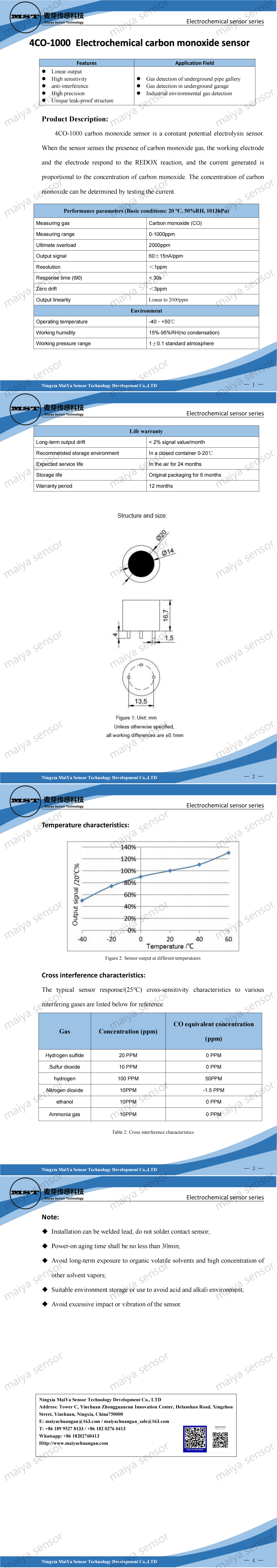 4CO-1000 carbon monoxide sensor is a constant potential electrolysis sensor. When the sensor senses the presence of carbon monoxide gas, the working electrode and the electrode respond to the REDOX reaction, and the current generated is proportional to the concentration of carbon monoxide. The concentration of carbon monoxide can be determined by testing the current.