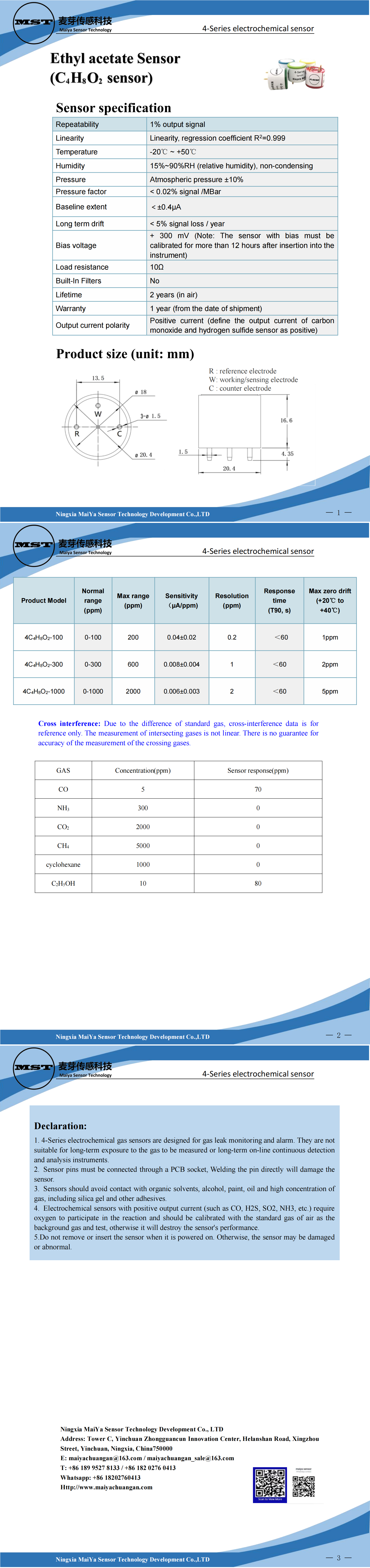 4-Series electrochemical gas sensors are designed for gas leak monitoring and alarm. They are not suitable for long-term exposure to the gas to be measured or long-term on-line continuous detection and analysis instruments.