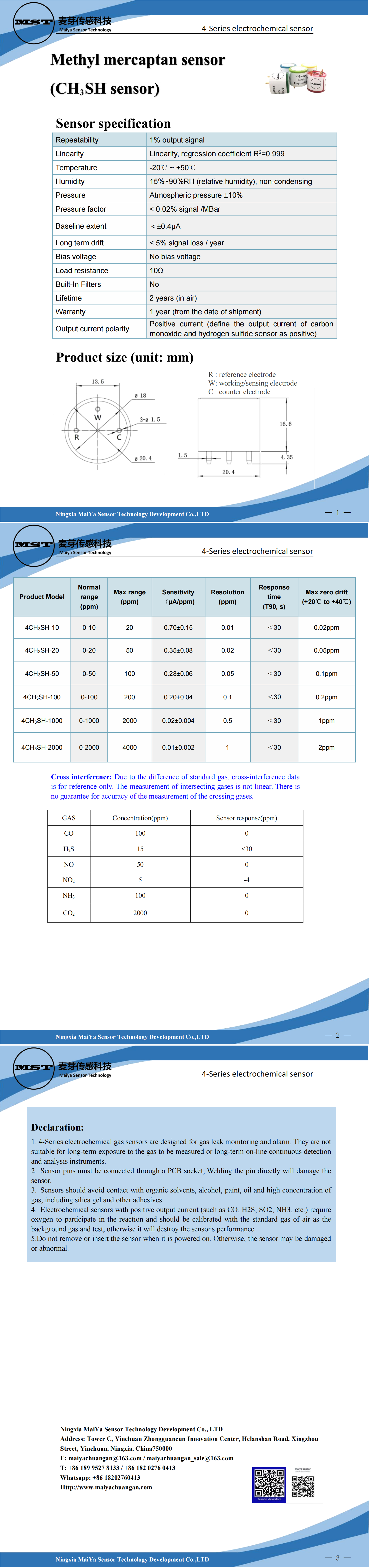 4-Series electrochemical gas sensors are designed for gas leak monitoring and alarm. They are not suitable for long-term exposure to the gas to be measured or long-term on-line continuous detection and analysis instruments.