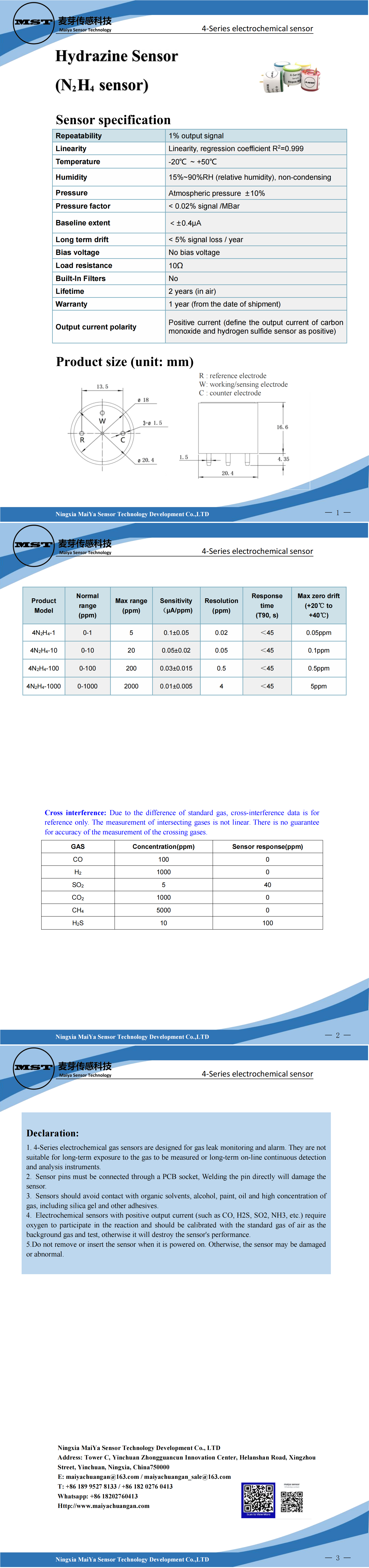 4-Series electrochemical gas sensors are designed for gas leak monitoring and alarm. They are not suitable for long-term exposure to the gas to be measured or long-term on-line continuous detection and analysis instruments.