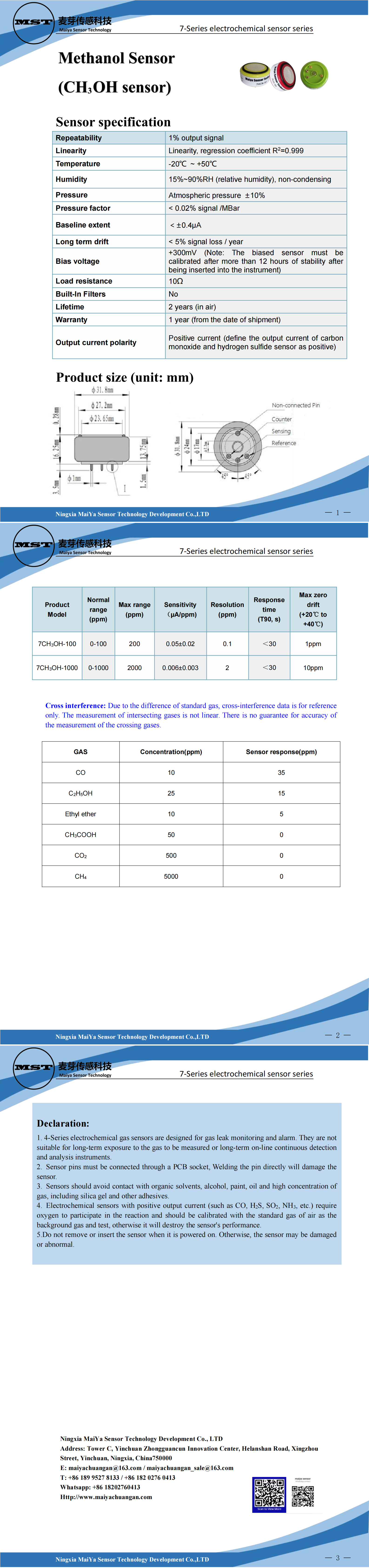 Methanol Sensor(CH?OH sensor)7-Series electrochemical sensor