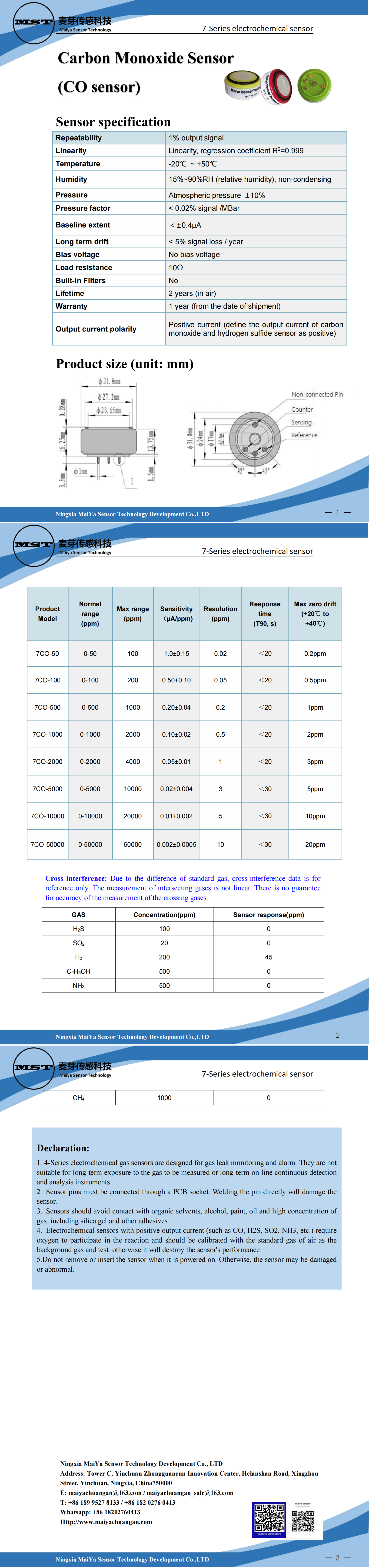 7-Series electrochemical gas sensors are designed for gas leak monitoring and alarm. They are not suitable for long-term exposure to the gas to be measured or long-term on-line continuous detection and analysis instruments.