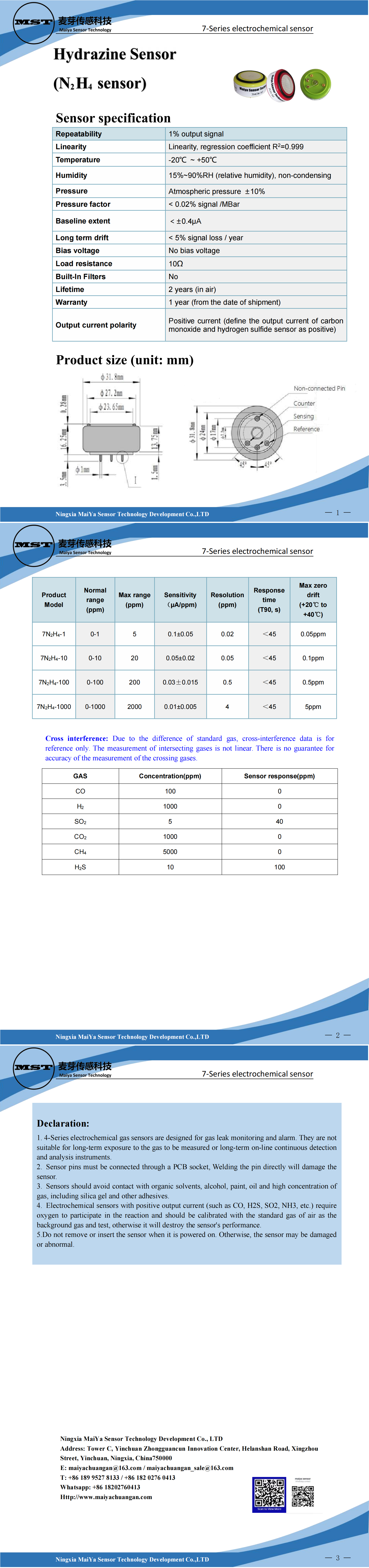 7-Series electrochemical gas sensors are designed for gas leak monitoring and alarm. They are not suitable for long-term exposure to the gas to be measured or long-term on-line continuous detection and analysis instruments.