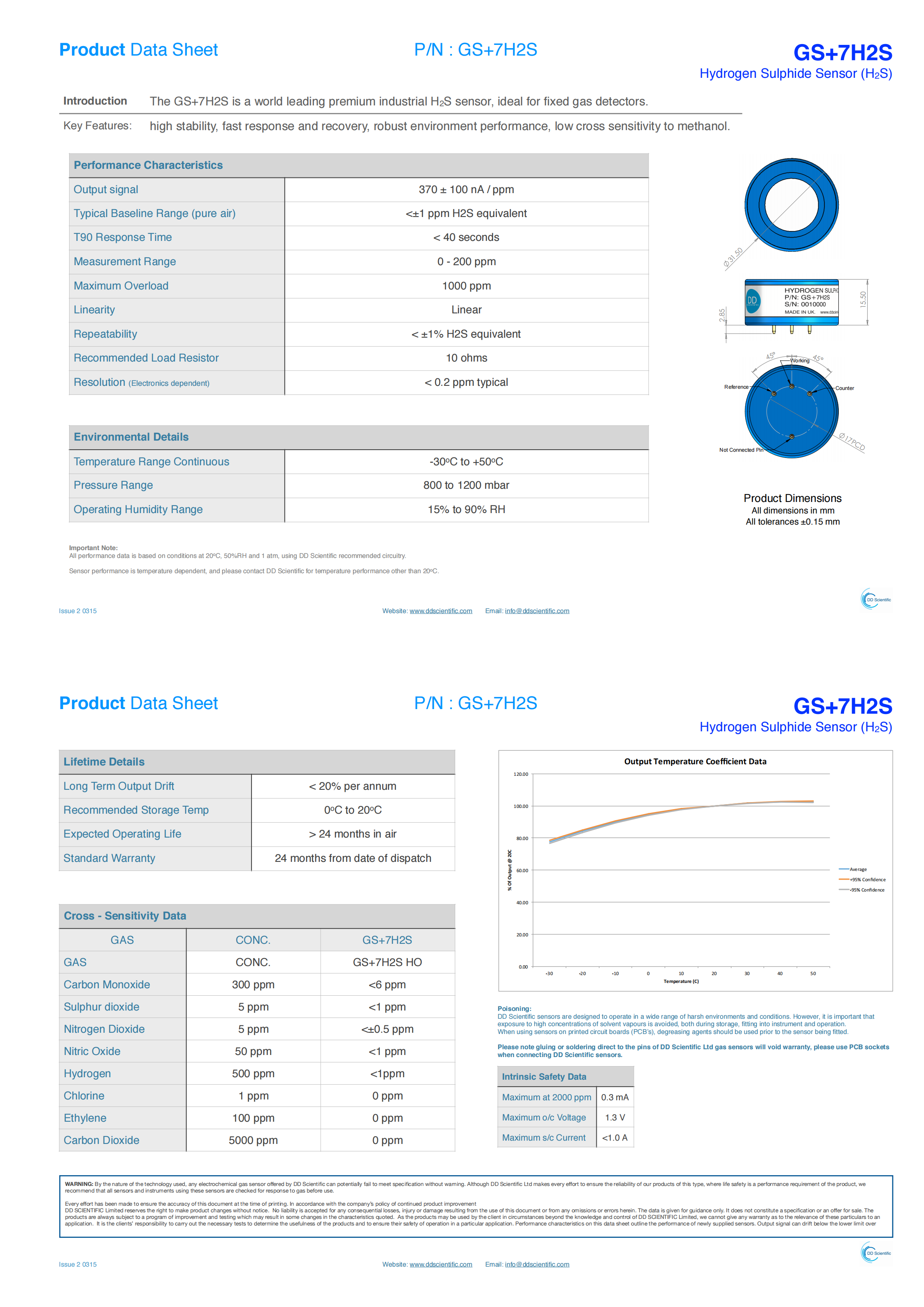 The GS+7H2S is a world leading premium industrial H2S sensor, ideal for fixed gas detectors. Key Features: high stability, fast response and recovery, robust environment performance, low cross sensitivity to methanol.