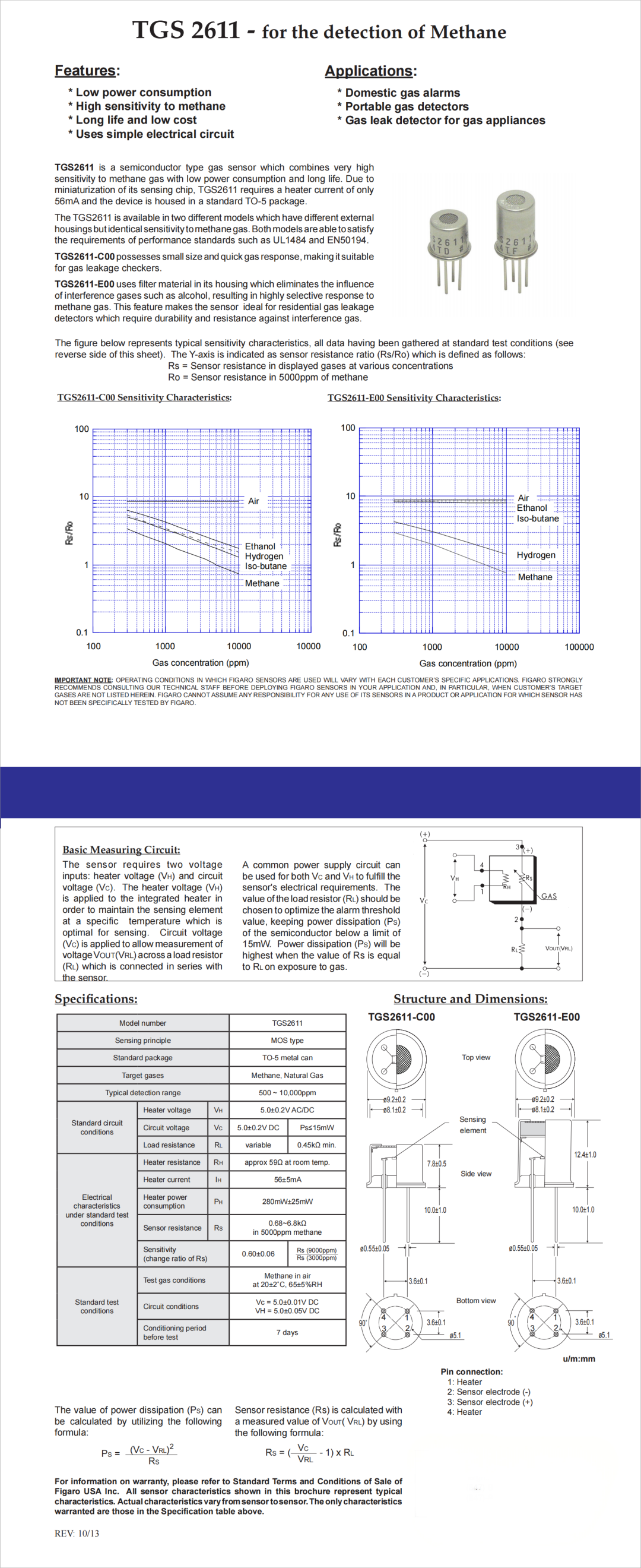 TGS2611 is a semiconductor type gas sensor which combines very high sensitivity to methane gas with low power consumption and long life. Due to miniaturization of its sensing chip, TGS2611 requires a heater current of only 56mA and the device is housed in a standard TO-5 package.