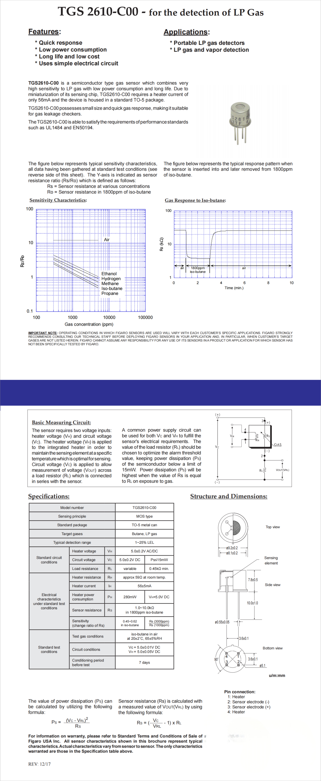 TGS2610-C00 is a semiconductor type gas sensor which combines very high sensitivity to LP gas with low power consumption and long life. Due to miniaturization of its sensing chip, TGS2610-C00 requires a heater current of only 56mA and the device is housed in a standard TO-5 package.