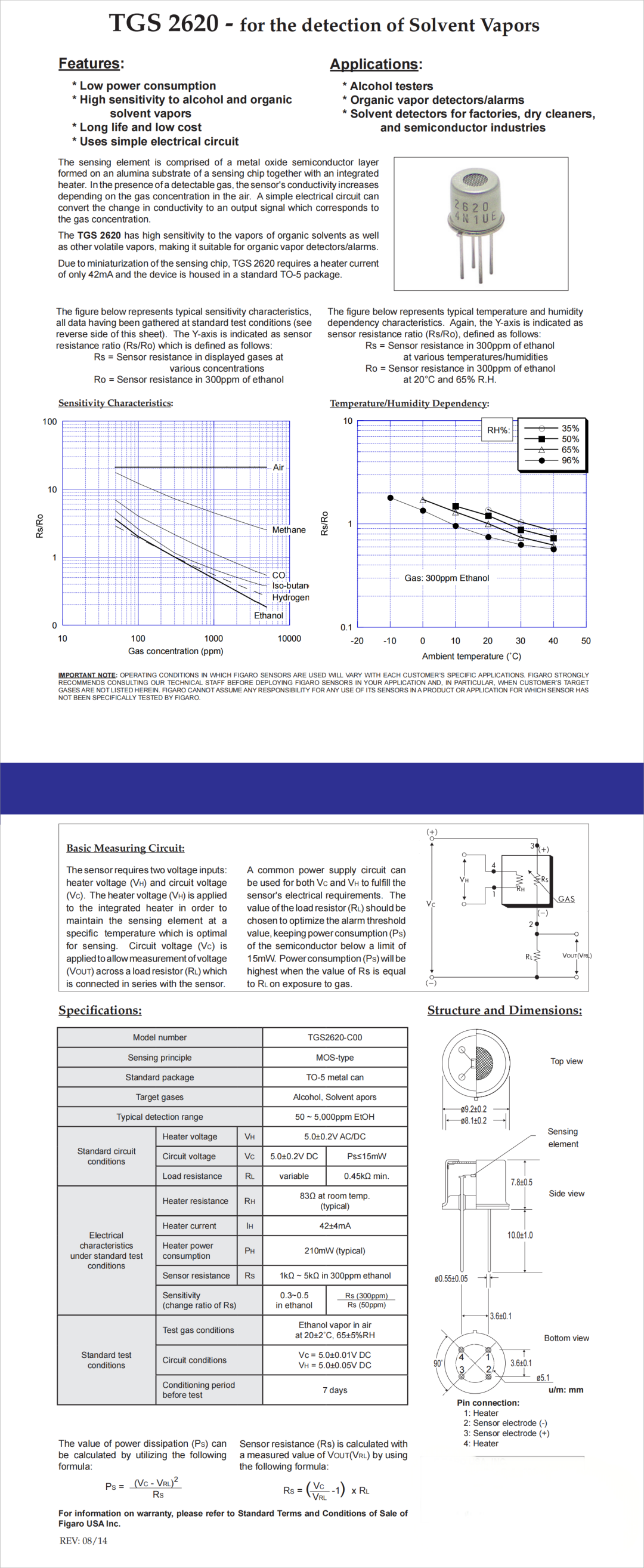 The TGS 2620 has high sensitivity to the vapors of organic solvents as well as other volatile vapors, making it suitable for organic vapor detectors/alarms. Due to miniaturization of the sensing chip, TGS 2620 requires a heater current of only 42mA and the device is housed in a standard TO-5 package.