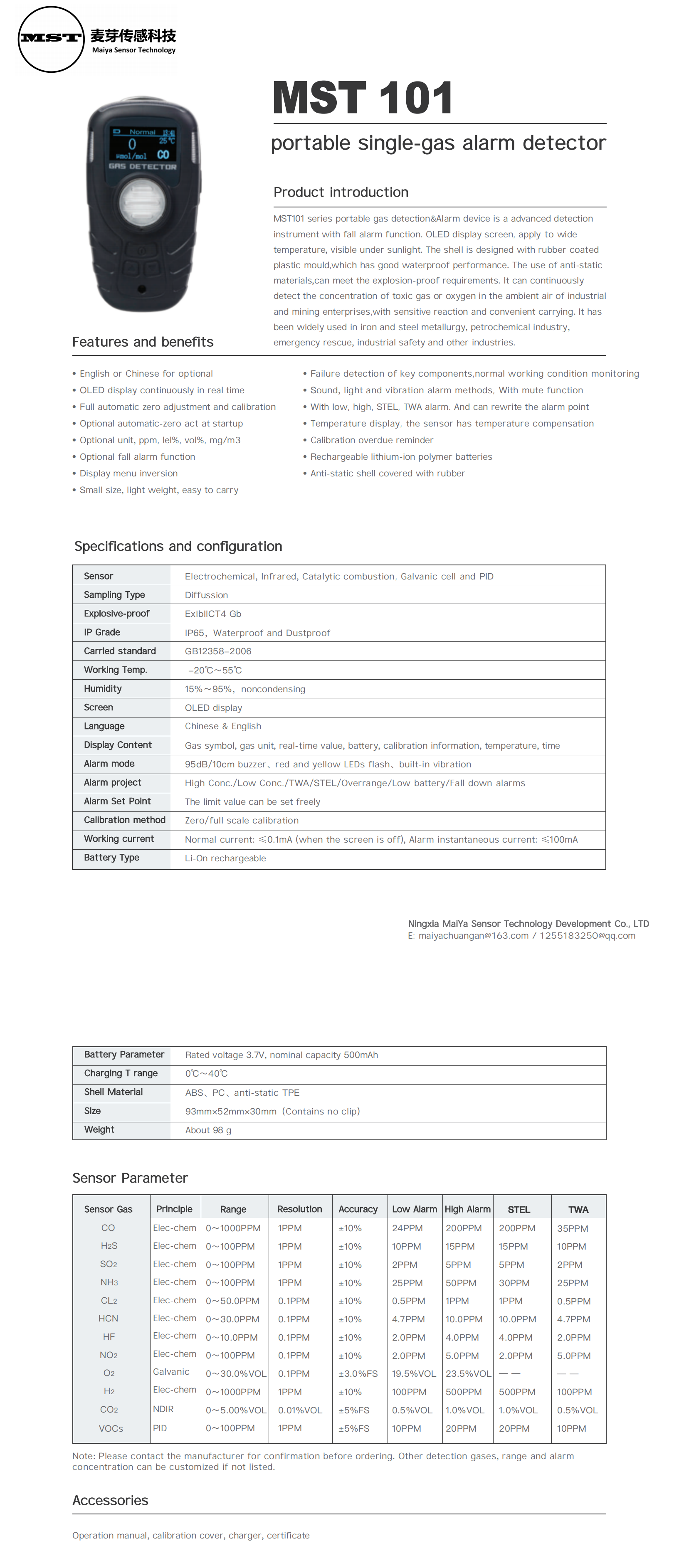 MST101 series portable gas detection&Alarm device is a advanced detection instrument with fall alarm function. OLED display screen, apply to wide temperature, visible under sunlight. The shell is designed with rubber coated plastic mould,which has good waterproof performance. The use of anti-static materials,can meet the explosion-proof requirements. It can continuously detect the concentration of toxic gas or oxygen in the ambient air of industrial and mining enterprises,with sensitive reaction and convenient carrying. It has been widely used in iron and steel metallurgy, petrochemical industry, emergency rescue, industrial safety and other industries.