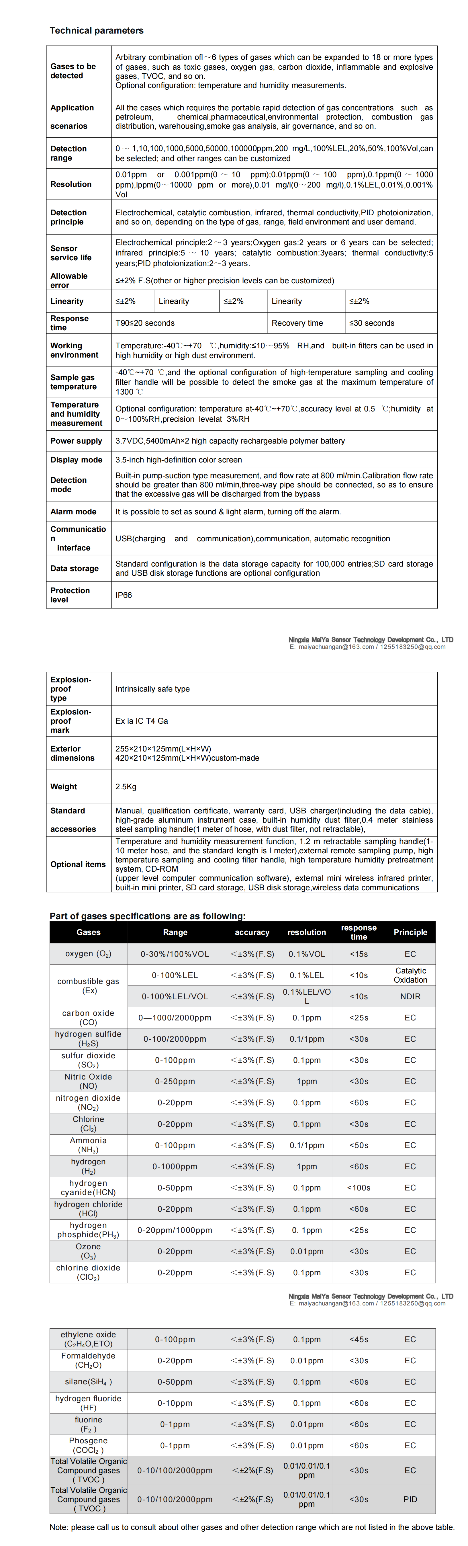 The portable composite gas analyzer can be used in: accurate detection and analysis of a variety of gas concentration and measurement of environmental temperature and humidity. adopted 3.5-inch high-definition color screen for real-time display, adopted the gas sensors of internationally well-known brands, and the main detection principles include: electrochemical, infrared, catalytic combustion, thermal conductivity, PID photoionization, and so on. Adopted Swiss high-precision capacitive digital temperature and humidity sensors. Advanced electric circuit design, mature kernel algorithm processing, unique external appearance design, had achieved a number of patents about the software works, external appearance, and so on. is suitable for detecting the concentrations of gases in the atmosphere environment in the pipeline or confined space; and the purity of the gas leakage and various high concentration single gases with the background gas as nitrogen gas or oxygen gas. The types for detection are more than 500 types.