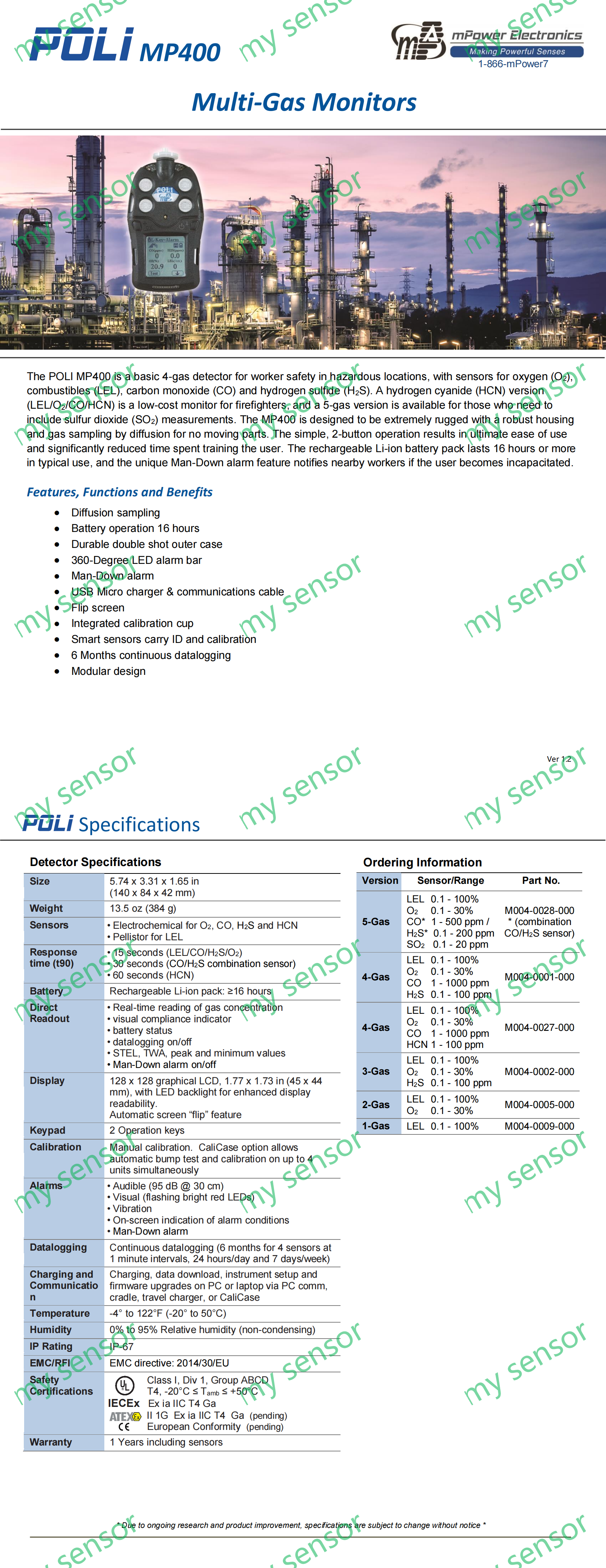 The POLI MP400 is a basic 4-gas detector for worker safety in hazardous locations, with sensors for oxygen (O2), combustibles (LEL), carbon monoxide (CO) and hydrogen sulfide (H2S). A hydrogen cyanide (HCN) version (LEL/O2/CO/HCN) is a low-cost monitor for firefighters, and a 5-gas version is available for those who need to include sulfur dioxide (SO2) measurements. The MP400 is designed to be extremely rugged with a robust housing and gas sampling by diffusion for no moving parts. The simple, 2-button operation results in ultimate ease of use and significantly reduced time spent training the user. The rechargeable Li-ion battery pack lasts 16 hours or more in typical use, and the unique Man-Down alarm feature notifies nearby workers if the user becomes incapacitated.