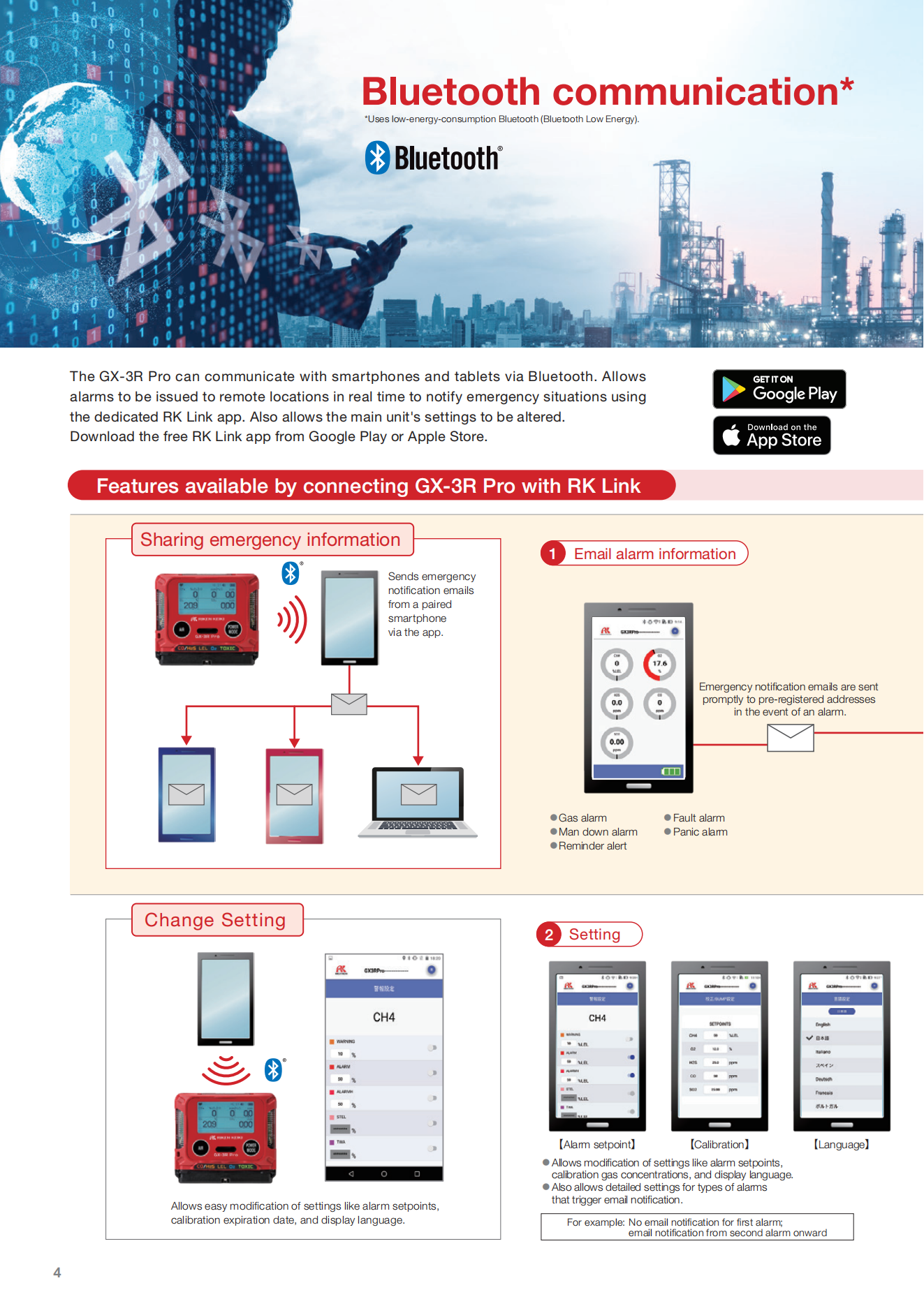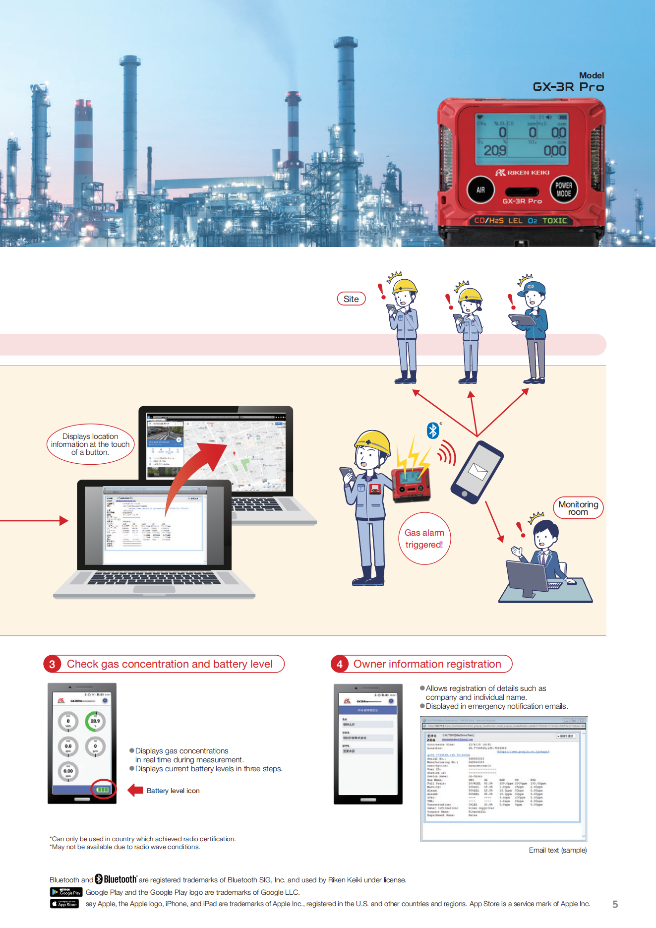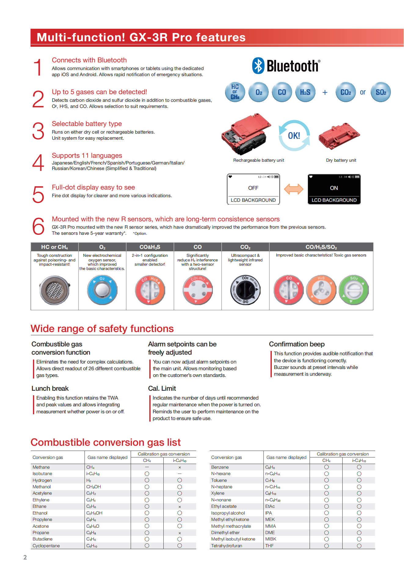 Allows fast and accurate informationsharing in emergencies. 5-year warranty The instrument and sensors have 5-year warranty"."Option. Up to 5 gases can be detected Detects carbon dioxide and sulfur dioxide inaddition to combustible gases, O2, H2S, and CO. Intrinsically safe explosion-proof construction and flame-proof enclosures Water and dust resistant, IP66/68 Robust design (Withstands 7m drop)