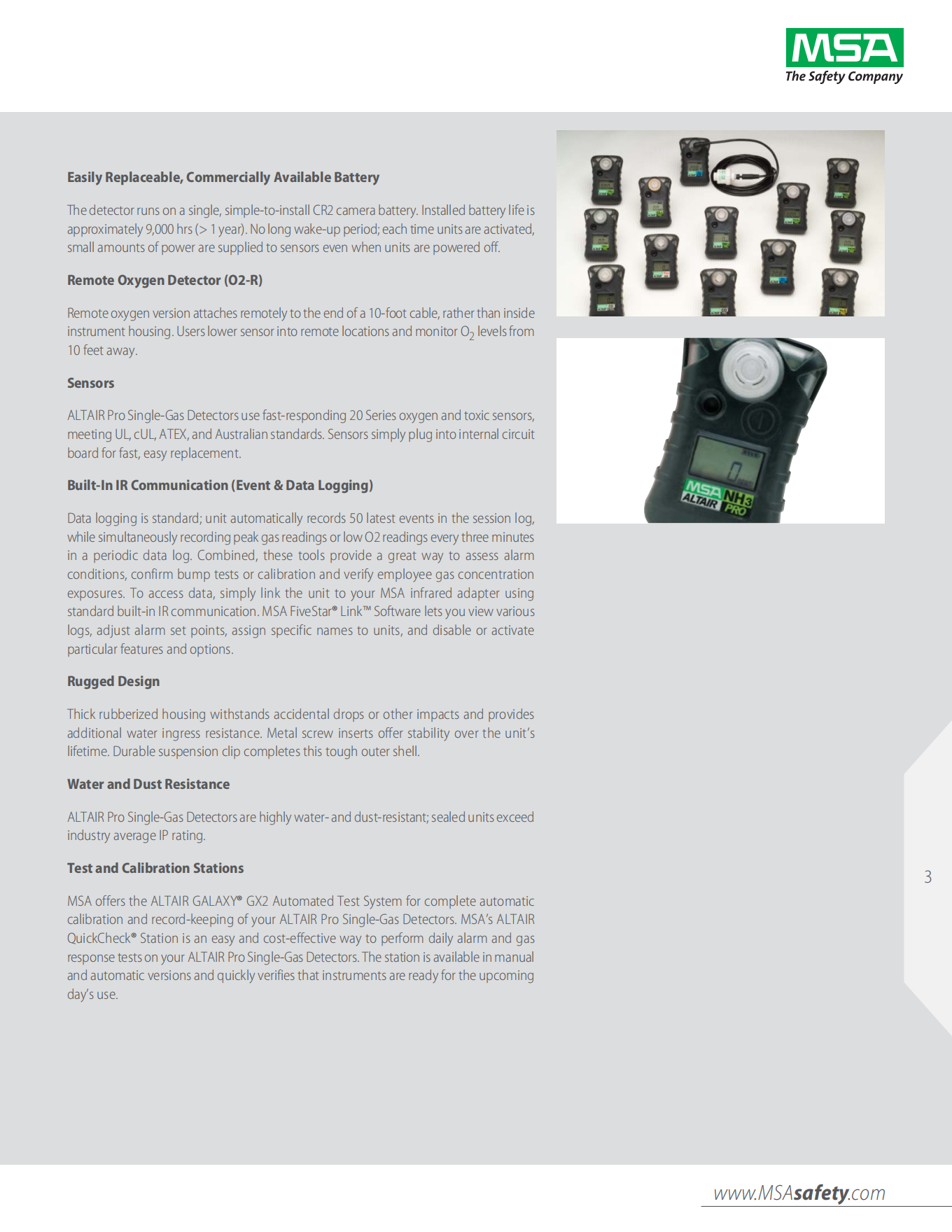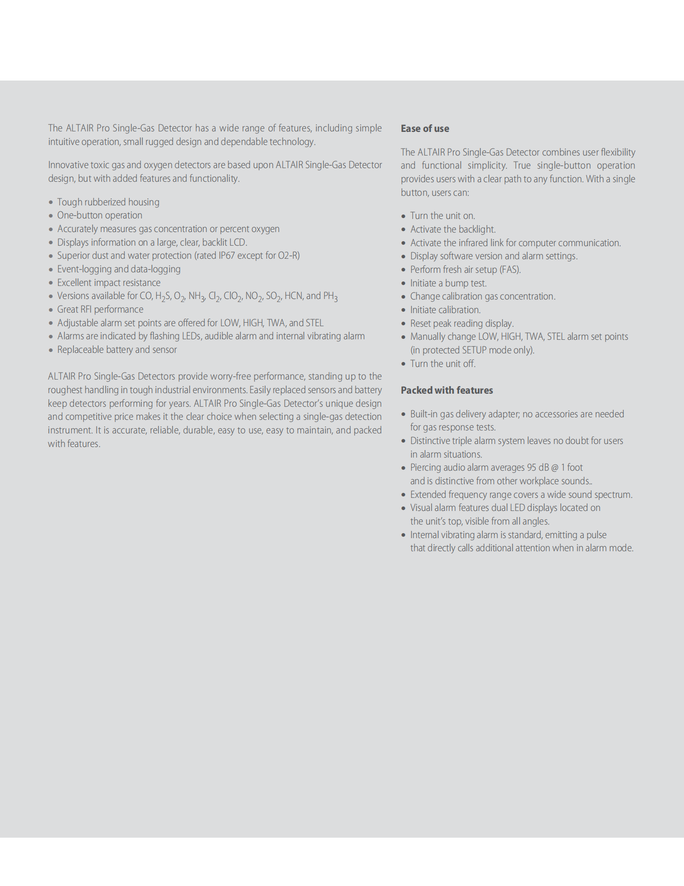 Based on the industry-standard ALTAIR Single-Gas Detector—but with added features and functionality—ALTAIR Pro toxic gas and oxygen detectors combine reliable detection and LED/audible/flashing/vibrating alarms with clear, backlit LCD displays. Electrochemical sensors measure concentrations of toxic gas (chlorine dioxide, hydrogen cyanide and phosphine) or percent oxygen. Purpose-built for superior dust and water protection, excellent impact resistance and excellent RFI performance.