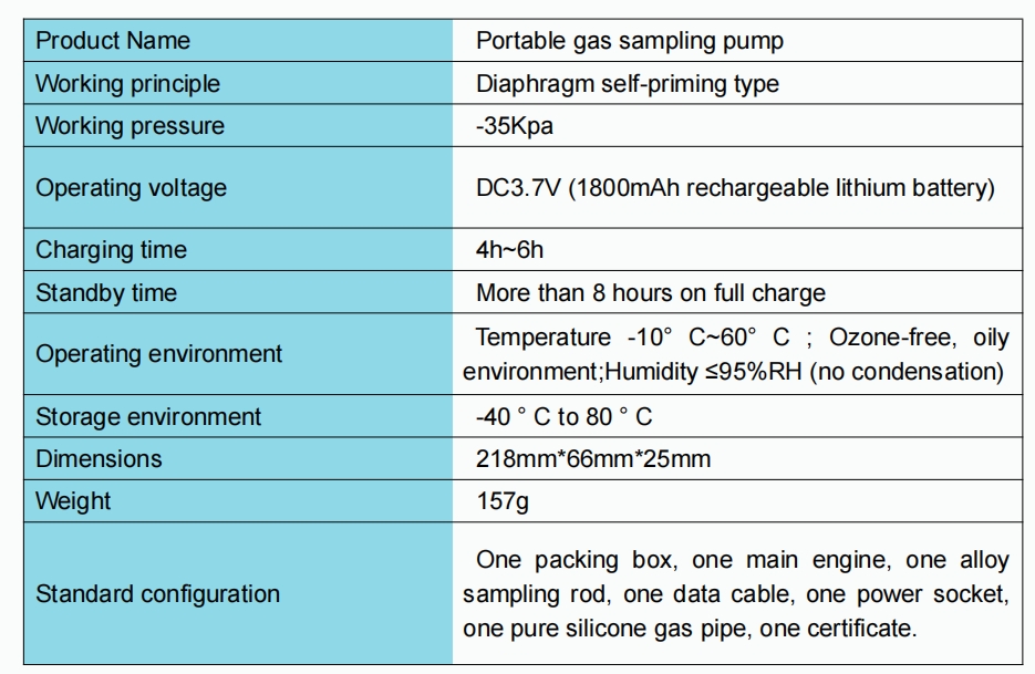 Hand-held portable gas sampling pump is made of advanced electronic technology and sophisticated technology. Can be connected with the company's compound gas detector, or with all kinds of imported or domestic gas.The detector is compatible. It is an ideal air pump to enter restricted space, such as mine city sewer pipe, cabin and other closed and narrow space gas sampling, detection of toxic and harmful gases in distant space.