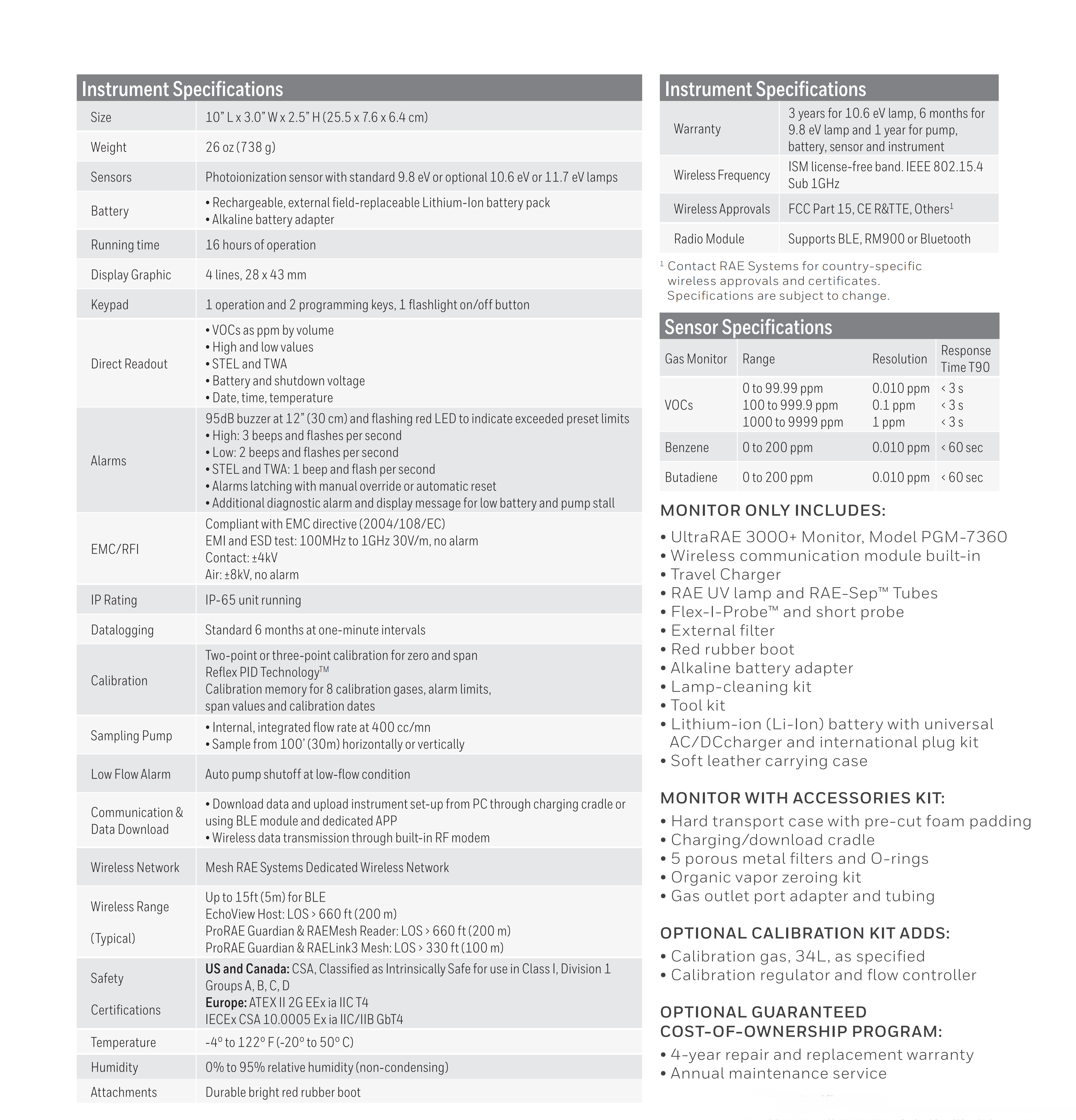 The UltraRAE 3000+ is one of the most advanced Compound-Specific Monitors on the market. Its Photoionization Detector's (PID) extended range of 0.01 to 10,000 ppm in VOC mode and 10 ppb to 200 ppm in benzene-specific mode makes it an ideal instrument for applications, from entry pre-screening during refinery and plant maintenance to hazardous material response, marine spill response and refinery down-stream monitoring.