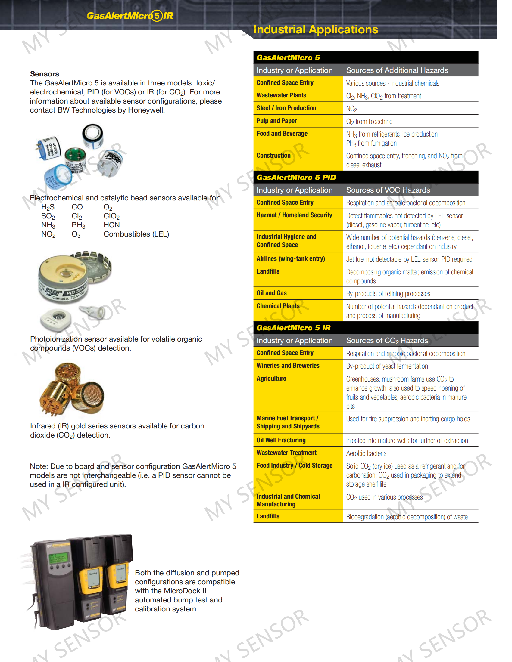 Simultaneously monitor and display up to fi ve atmospheric hazards with the GasAlertMicro 5 Series. Adaptable to a variety of applications, the GasAlertMicro 5 Series has an extensive selection of user-settable fi eld options and is available as either a standard toxic gas model, a PID model for the detection VOCs, or an IR model for CO2 detection.
