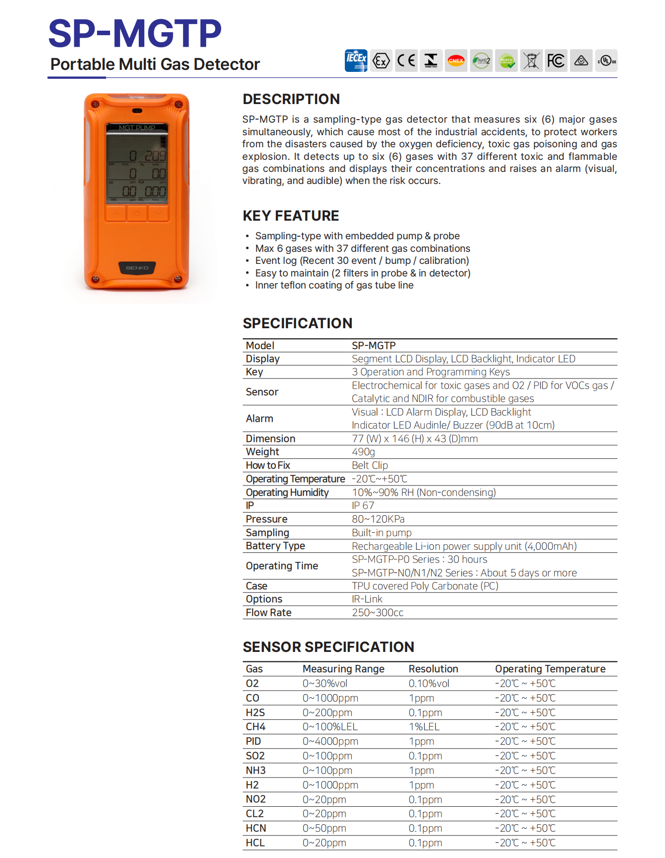SP-MGTP is a sampling-type gas detector that measures six (6) major gases simultaneously, which cause most of the industrial accidents, to protect workers from the disasters caused by the oxygen deficiency, toxic gas poisoning and gas explosion.